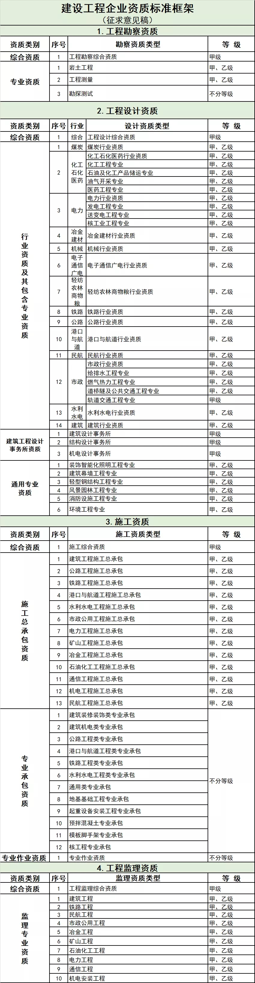 附:《建設(shè)工程企業(yè)資質(zhì)標(biāo)準(zhǔn)框架(征求意見稿)》