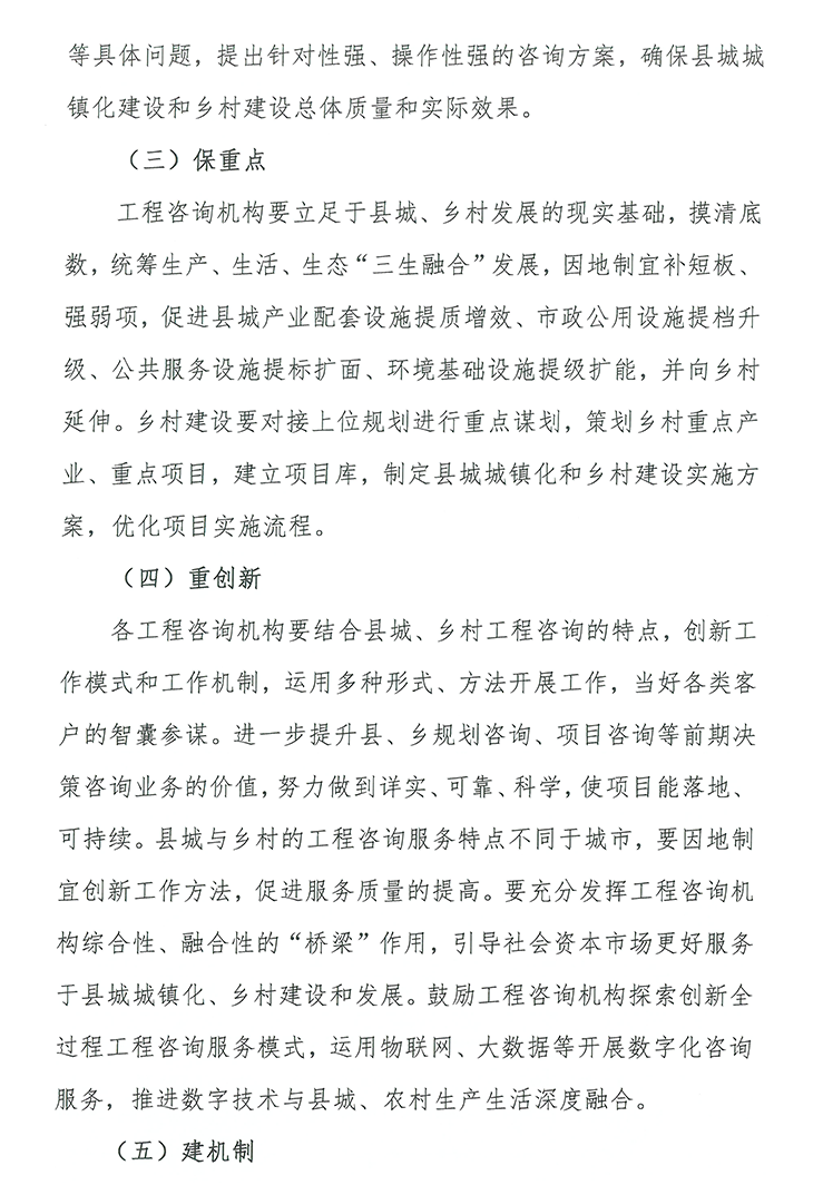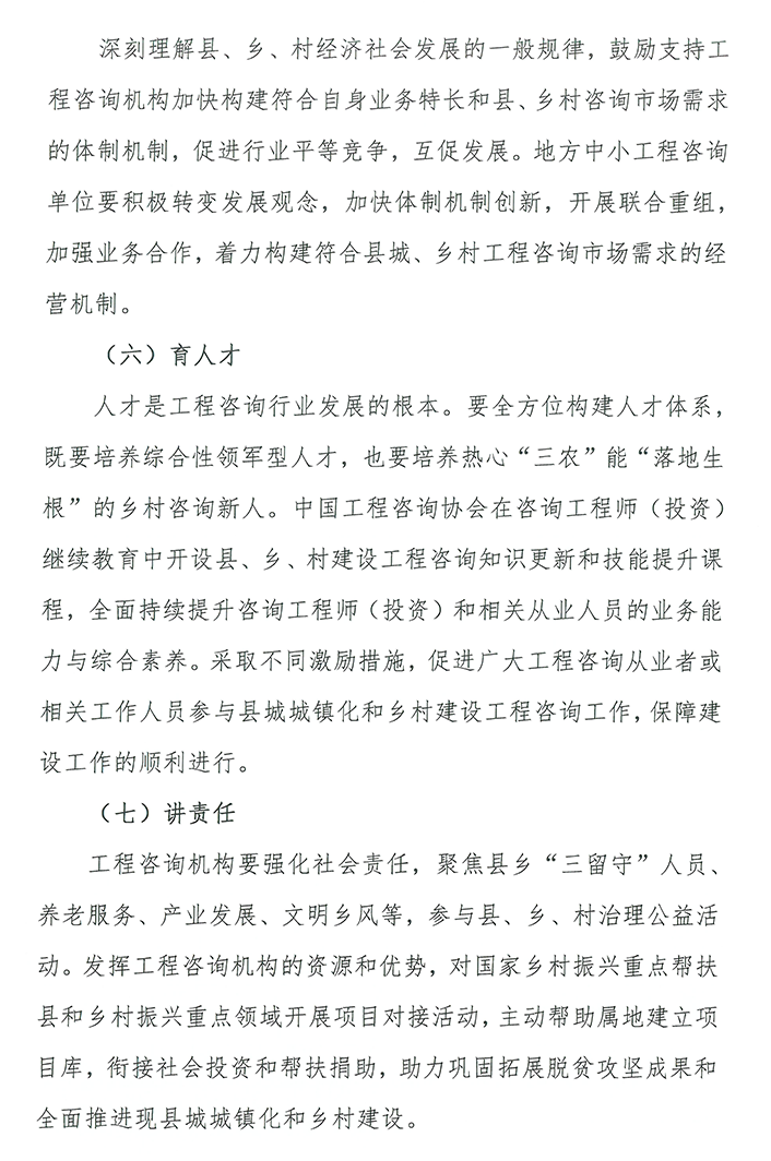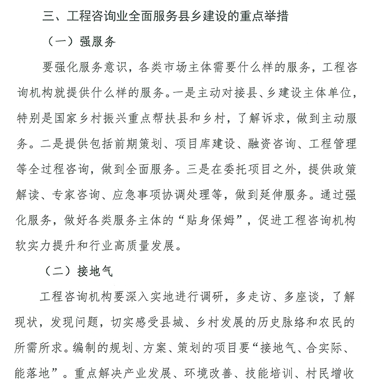 工程咨詢業(yè)是技術(shù)密集、智力密集型行業(yè),要加快實(shí)現(xiàn)高質(zhì)量發(fā)展,關(guān)鍵還是“抓人才”。近日中國(guó)工程咨詢協(xié)會(huì)印發(fā)了《關(guān)于工程咨詢機(jī)構(gòu)參與縣城城鎮(zhèn)化建設(shè)、鄉(xiāng)村建設(shè)行動(dòng)的指導(dǎo)意見(jiàn)》,詳細(xì)闡述了工程咨詢?nèi)嗽趨⑴c縣城城鎮(zhèn)化建設(shè)、鄉(xiāng)村建設(shè)的素質(zhì)提升點(diǎn)和工程咨詢團(tuán)隊(duì)的團(tuán)隊(duì)建設(shè)點(diǎn)。