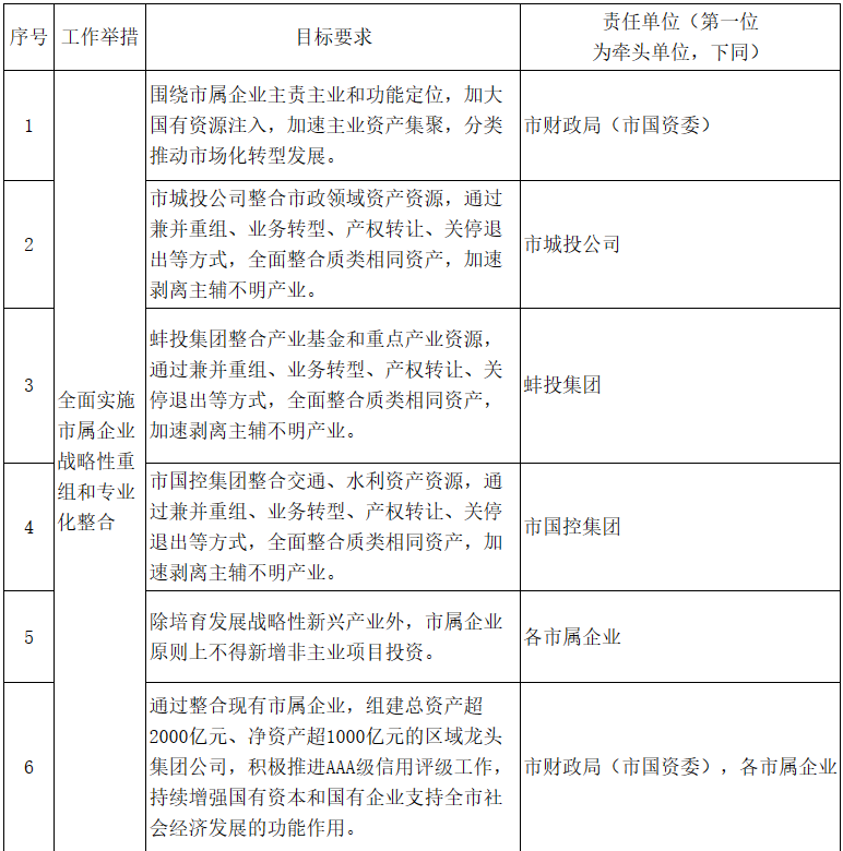 1.全面實(shí)施市屬企業(yè)戰(zhàn)略性重組和專(zhuān)業(yè)化整合。圍繞市屬企業(yè)主責(zé)主業(yè)和功能定位,加大國(guó)有資源注入,加速主業(yè)資產(chǎn)集聚,分類(lèi)推動(dòng)市場(chǎng)化轉(zhuǎn)型發(fā)展。市城投公司整合市政領(lǐng)域資產(chǎn)資源,蚌投集團(tuán)整合產(chǎn)業(yè)基金和重點(diǎn)產(chǎn)業(yè)資源,市國(guó)控集團(tuán)整合交通、水利資產(chǎn)資源,通過(guò)兼并重組、業(yè)務(wù)轉(zhuǎn)型、產(chǎn)權(quán)轉(zhuǎn)讓、關(guān)停退出等方式,全面整合質(zhì)類(lèi)相同資產(chǎn),加速剝離主輔不明產(chǎn)業(yè)。除培育發(fā)展戰(zhàn)略性新興產(chǎn)業(yè)外,市屬企業(yè)原則上不得新增非主業(yè)項(xiàng)目投資。在此基礎(chǔ)上,通過(guò)整合現(xiàn)有市屬企業(yè),組建總資產(chǎn)超2000億元、凈資產(chǎn)超1000億元的區(qū)域龍頭集團(tuán)公司,積極推進(jìn)AAA級(jí)信用評(píng)級(jí)工作,持續(xù)增強(qiáng)國(guó)有資本和國(guó)有企業(yè)支持全市社會(huì)經(jīng)濟(jì)發(fā)展的功能作用?!藏?zé)任單位:市財(cái)政局(市國(guó)資委),各市屬企業(yè)〕
