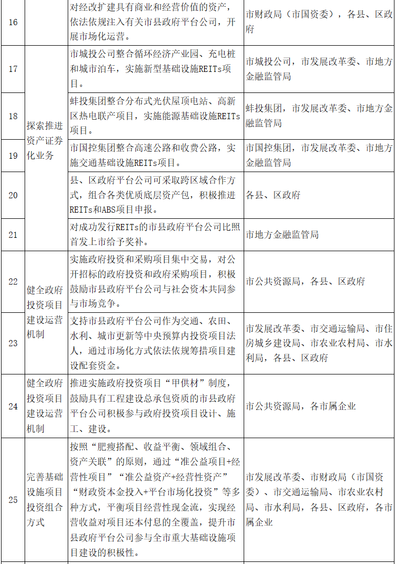 6.探索推進(jìn)資產(chǎn)證券化業(yè)務(wù)。市城投公司整合循環(huán)經(jīng)濟(jì)產(chǎn)業(yè)園、充電樁和城市泊車(chē),實(shí)施新型基礎(chǔ)設(shè)施REITs項(xiàng)目;蚌投集團(tuán)整合分布式光伏屋頂電站、高新區(qū)熱電聯(lián)產(chǎn)項(xiàng)目,實(shí)施能源基礎(chǔ)設(shè)施REITs項(xiàng)目;市國(guó)控集團(tuán)整合高速公路和收費(fèi)公路,實(shí)施交通基礎(chǔ)設(shè)施REITs項(xiàng)目??h、區(qū)政府平臺(tái)公司可采取跨區(qū)域合作方式,組合各類(lèi)優(yōu)質(zhì)底層資產(chǎn)包,積極推進(jìn)REITs和ABS項(xiàng)目申報(bào)。2025年底前,市屬企業(yè)力爭(zhēng)發(fā)行REITs不低于2支,募集資金規(guī)模不低于50億元。對(duì)成功發(fā)行REITs的市縣政府平臺(tái)公司比照首發(fā)上市給予獎(jiǎng)補(bǔ)。(責(zé)任單位:市發(fā)展改革委、市地方金融監(jiān)管局、各縣、區(qū)政府,各市屬企業(yè))