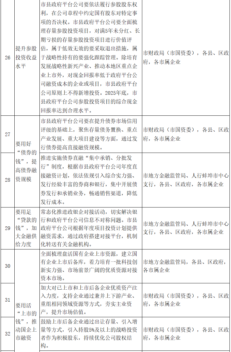 (四)持續(xù)提升融資能力。2025年底,市屬企業(yè)培育2戶(hù)以上國(guó)有控股企業(yè)在主要資本市場(chǎng)成功上市。市縣政府平臺(tái)公司直接融資規(guī)模超過(guò)300億元,間接融資規(guī)模超過(guò)400億元。