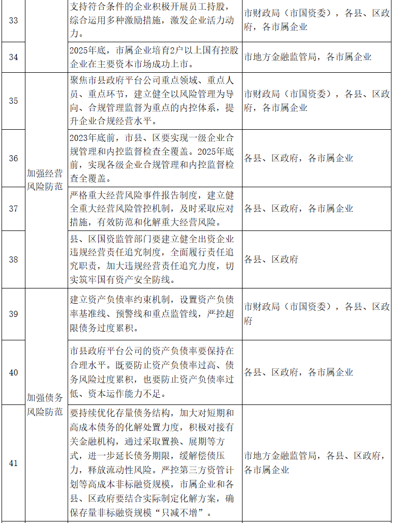 (五)切實(shí)加強(qiáng)風(fēng)險(xiǎn)防范。2025年底,市縣政府平臺(tái)公司實(shí)現(xiàn)對(duì)經(jīng)營(yíng)、債務(wù)、擔(dān)保等全方位、全流程的風(fēng)險(xiǎn)管控,抗風(fēng)險(xiǎn)綜合能力進(jìn)一步增強(qiáng)。企業(yè)合規(guī)管理和內(nèi)控監(jiān)督檢查實(shí)現(xiàn)全覆蓋,合規(guī)經(jīng)營(yíng)水平切實(shí)提高。存量債務(wù)結(jié)構(gòu)趨于合理,債務(wù)期限和成本進(jìn)一步優(yōu)化。對(duì)外擔(dān)保規(guī)??傮w合理,擔(dān)保風(fēng)險(xiǎn)基本可控。政府隱性債務(wù)化解完成既定任務(wù)目標(biāo)。