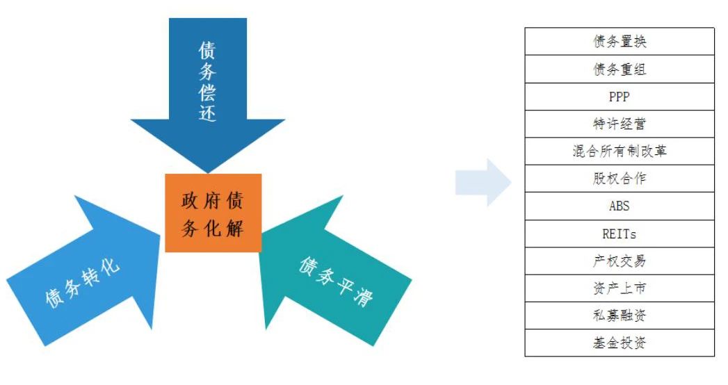 結(jié)合國家相關(guān)政策、學(xué)術(shù)理論以及實(shí)踐經(jīng)驗(yàn),我們提出了圍繞“債務(wù)平滑、債務(wù)轉(zhuǎn)化、債務(wù)償還”三大策略方向,主要運(yùn)用“債務(wù)置換、債務(wù)重組、PPP、特許經(jīng)營、混合所有制改革、股權(quán)合作、ABS、REITs、產(chǎn)權(quán)交易、資產(chǎn)上市、私募融資、基金投資”十二種工具,建立明確的債務(wù)化解規(guī)劃,制定分年度債務(wù)化解目標(biāo),切實(shí)有效實(shí)現(xiàn)政府隱性債的化解,促進(jìn)地方政府投融資運(yùn)作健康可持續(xù)。