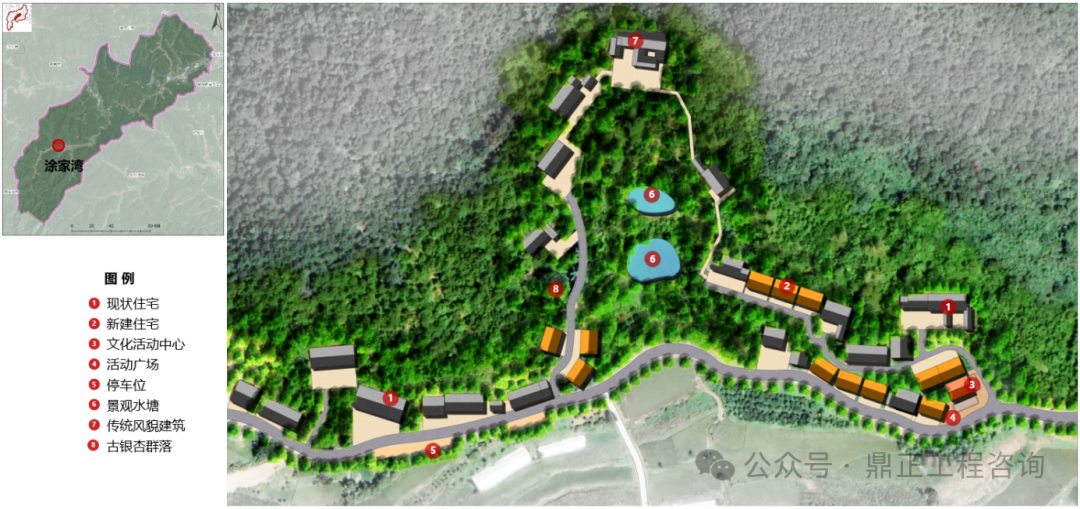 九口堰村為滿足村莊集并及遠期人口增長需求,規(guī)劃于涂家灣設置一處居民安置點。場地現(xiàn)狀民居較多,地形高差大,通過梳理現(xiàn)狀閑置宅基地、拆除破舊房屋等措施整理出可以進行布局居民點的建設用地,點狀布局居民點,居民點每戶占地140平方米,共安置12戶。