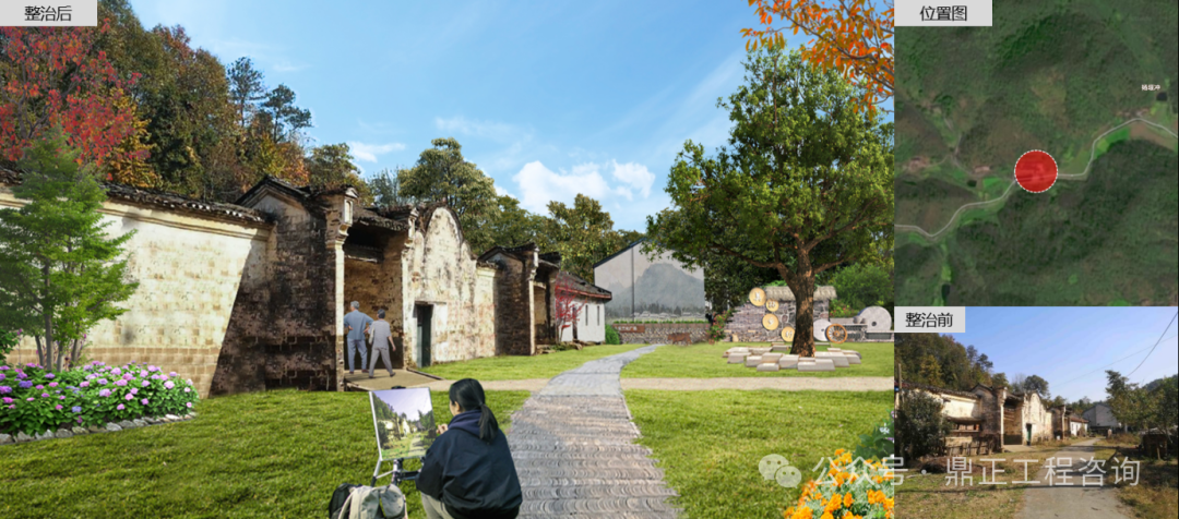 九口堰村入口空間,通過清理道路臟亂雜物,保留并完善修復破損路面;清理道路兩側雜草,梳理林下空間,沿線可播撒草籽,營造整齊干凈的鄉(xiāng)野景觀;結合九口堰村特色的古銀杏資源、香菇產業(yè)以及地方特色,于村口增設景墻,形成村莊入口標志;路邊環(huán)境梳理,通過木樁作為空間分界物,植栽時令花卉,作為背景點綴。