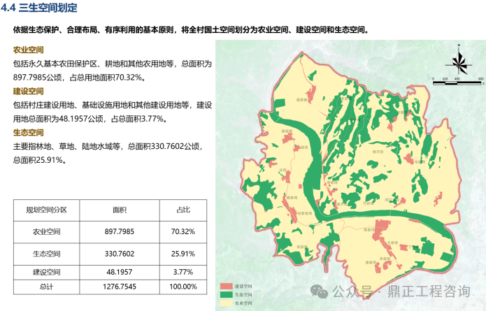 如雙河村結合“田、宅、水、林、產、景”等要素優(yōu)化用地結構,集約土地利用,全要素管控。落實上位空間管控、堅持農業(yè)生態(tài)優(yōu)先、劃定底線保護控制線。依據生態(tài)保護、合理布局、有序利用的基本原則,將全村國土空間劃分為農業(yè)空間、建設空間和生態(tài)空間,明確生態(tài)保護、農業(yè)生產、村莊建設的主要區(qū)域。同時,對三類空間制定管控要求,強化村莊的底線管控。