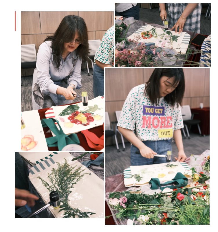 活動(dòng)現(xiàn)場充滿了歡聲笑語,大家紛紛使出“洪荒之力”,咚咚咚…….伴隨著細(xì)碎的敲擊聲和花草香,一幅幅色彩斑斕的植物圖案躍然紙上。