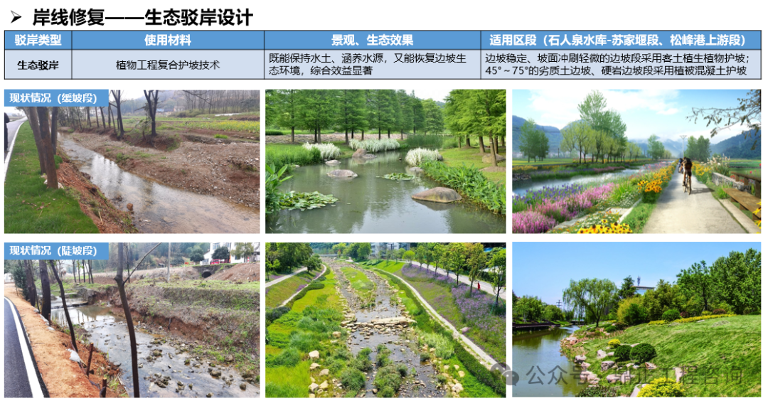 生態(tài)方面,打造“羊樓生態(tài)廊”,以水提質(zhì),修復(fù)流域生態(tài),即實(shí)施一批駁岸整治、水質(zhì)提升、生境構(gòu)建等河道治理措施進(jìn)行水岸共治。針對水生態(tài)的修復(fù),根據(jù)不同水體類型提出技術(shù)方式;對于岸線的修復(fù),又針對不同的駁岸類型提出適用的整治措施。