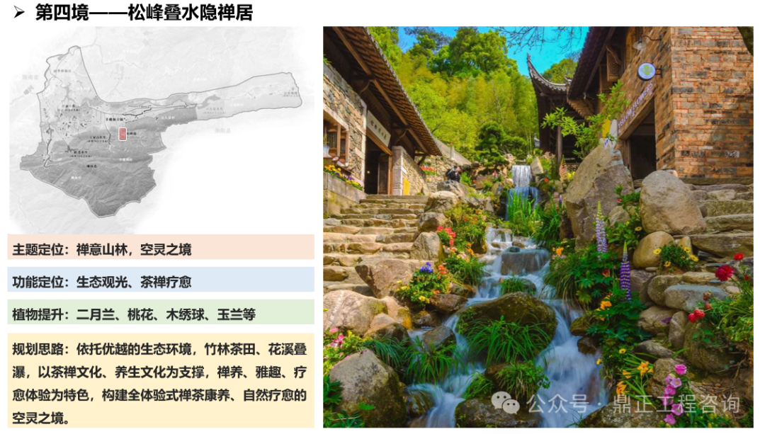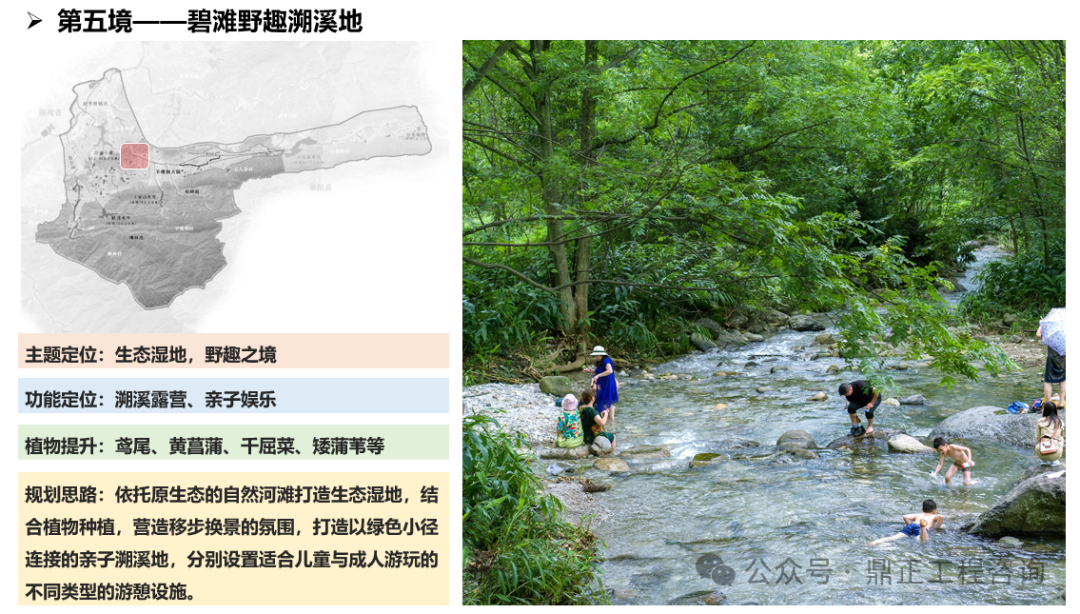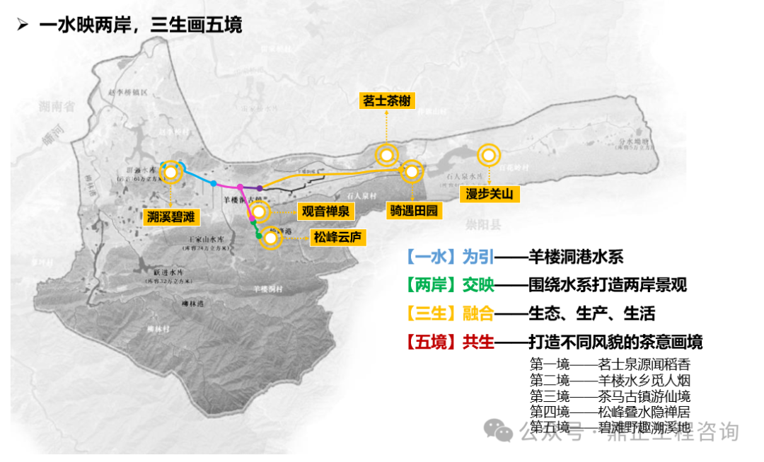 一水為引,指出治理對象,即羊樓洞港小流域;兩岸交映,指出治理范圍,即包括上下游、左右岸、堤內(nèi)外;三生融合,指出治理路徑,即走好生產(chǎn)、生活、生態(tài)協(xié)調(diào)發(fā)展之路;五境共生,即為五個治理分區(qū),通過分段體現(xiàn)差異化分區(qū)的理念,以線帶面也利于實(shí)施過程中分期分段逐步推進(jìn)。每個分區(qū)都有具體的功能定位、治理目標(biāo)、治理標(biāo)準(zhǔn),因此不同分區(qū)名稱就是該區(qū)治理特色的高度凝練,既要體現(xiàn)水系的區(qū)位,如“茗士泉源”對應(yīng)相公泉,“茶馬古鎮(zhèn)”對應(yīng)羊樓洞古鎮(zhèn),“松峰”對應(yīng)松峰山;也要體現(xiàn)水系的形態(tài),如“泉”、“溪”、“疊水”等;還要體現(xiàn)水系的功能,如“稻香”對應(yīng)田園塘渠,“水鄉(xiāng)”對應(yīng)生活河道,“碧灘”對應(yīng)生態(tài)濕地等。
