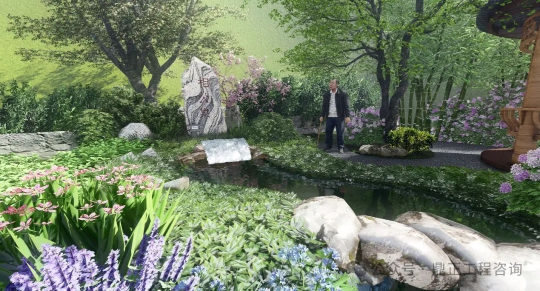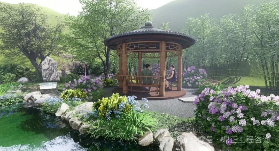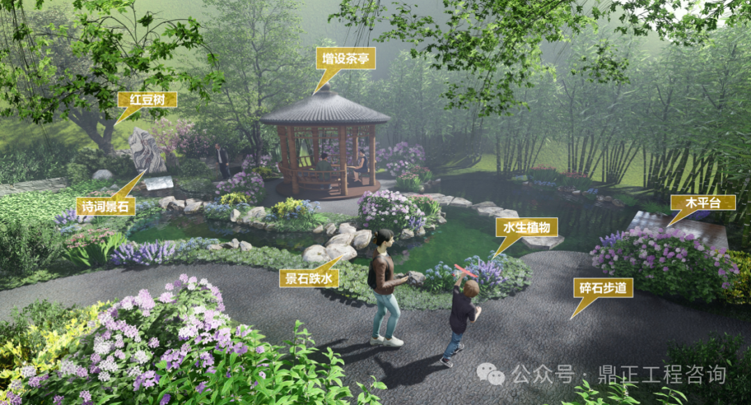 水景觀水文化打造:通過深挖相公泉?dú)v史文化內(nèi)涵,進(jìn)行本地印象提煉?!跋喙币辉~在古代,是妻子對丈夫的稱呼,也是君子、生員(秀才、相公)、宰相的另一種叫法。君子愛茶,沏茶品茗,修煉品性,以茶可雅志,茶是象征著塵世的純潔。設(shè)計(jì)從自然山水出發(fā),落位于閑情逸致設(shè)計(jì)基調(diào),泉眼處采用題字景石配上一棵姿態(tài)旖旎的紅豆,視線端頭一幅竹影錦鯉、花木跌水的畫面映入眼簾,兩側(cè)的樹木林立,開合有致,整個節(jié)點(diǎn)的中心是一座圓頂茶亭,在亭中,一壺清茶問道,仿佛拉近了古今往事,也增加了場地的記憶,呈現(xiàn)出 “千年古樹頻招手,萬年清泉溢清香”的意境。