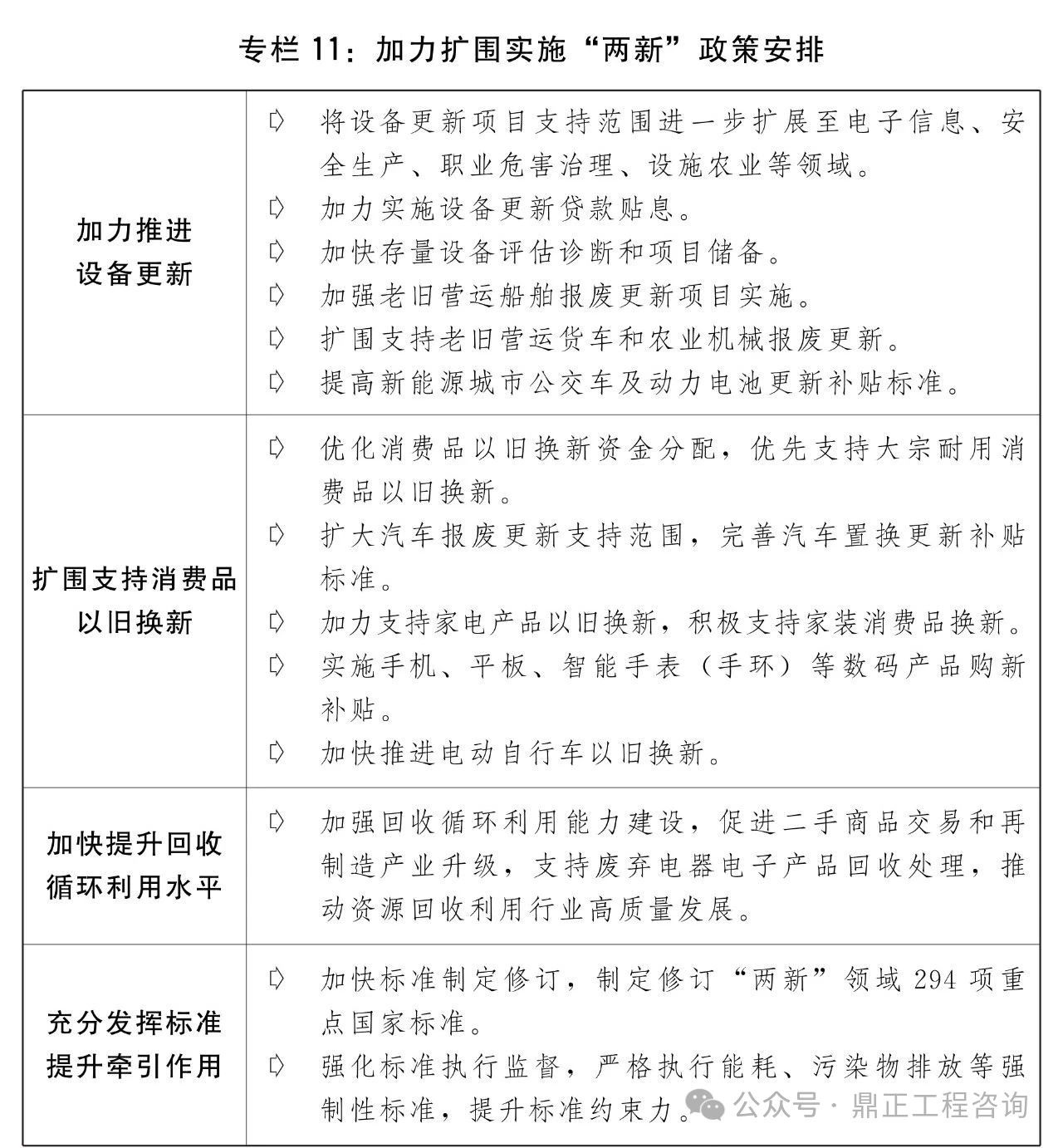 安排超長期特別國債5000億元支持大規(guī)模設(shè)備更新和消費(fèi)品以舊換新,統(tǒng)籌投資、財(cái)政、金融等綜合性政策,深入推進(jìn)設(shè)備更新、消費(fèi)品以舊換新、回收循環(huán)利用、標(biāo)準(zhǔn)提升四大行動(dòng)。進(jìn)一步加大重點(diǎn)領(lǐng)域設(shè)備更新項(xiàng)目支持力度,加力實(shí)施設(shè)備更新貸款貼息,加快存量設(shè)備評估診斷和項(xiàng)目儲(chǔ)備。進(jìn)一步支持消費(fèi)品以舊換新,擴(kuò)大汽車報(bào)廢更新支持范圍,完善汽車置換更新補(bǔ)貼標(biāo)準(zhǔn),實(shí)施手機(jī)、平板等數(shù)碼產(chǎn)品購新補(bǔ)貼,積極支持家裝消費(fèi)品換新,簡化補(bǔ)貼申領(lǐng)和支付流程,完善資金監(jiān)管機(jī)制,嚴(yán)厲打擊價(jià)格欺詐和違規(guī)騙補(bǔ)套補(bǔ)行為。