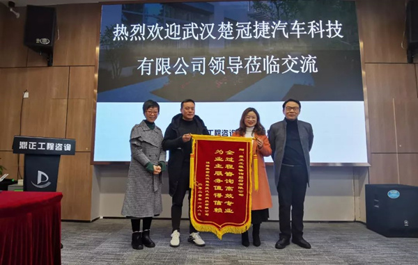2020年1月14日,武漢楚冠捷汽車科技有限公司龔經(jīng)理、朱主任蒞臨鼎正咨詢公司,特向為其二期廠房建設項目提供全過程工程咨詢服務的鼎正咨詢團隊及項目負責人程正一贈送錦旗并表達感謝。