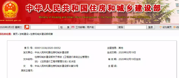2020年3月3日,住建部50號(hào)令“住房和城鄉(xiāng)建設(shè)部關(guān)于修改《工程造價(jià)咨詢企業(yè)管理辦法》《注冊(cè)造價(jià)工程師管理辦法》的決定”一夜間在工程咨詢行業(yè)引發(fā)了激烈的討論。